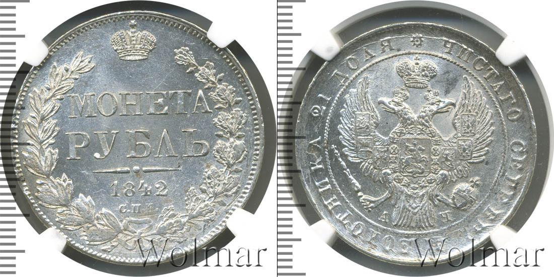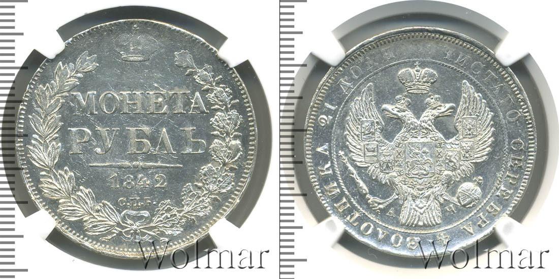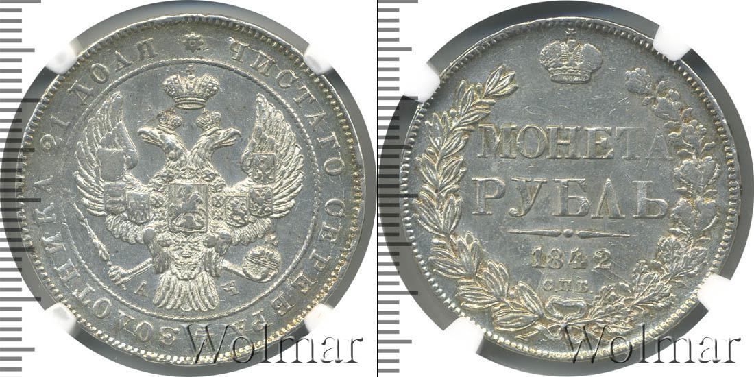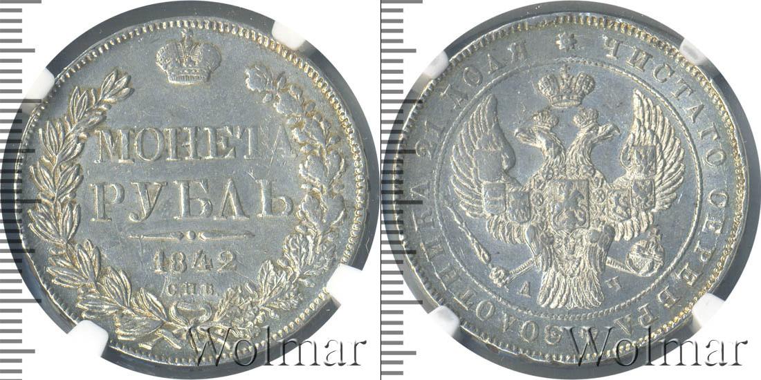 Край легенды украшен зубчатым узором. Вдоль него нарисован растительный орнамент. Внутри венка указан номинал, товарный знак монетного двора и год эмиссии. «МОНЕТА РУБЛЬ», «1842», «С.П.Б.» написаны горизонтально четырьмя строчками. Вверху легенды изображена корона.