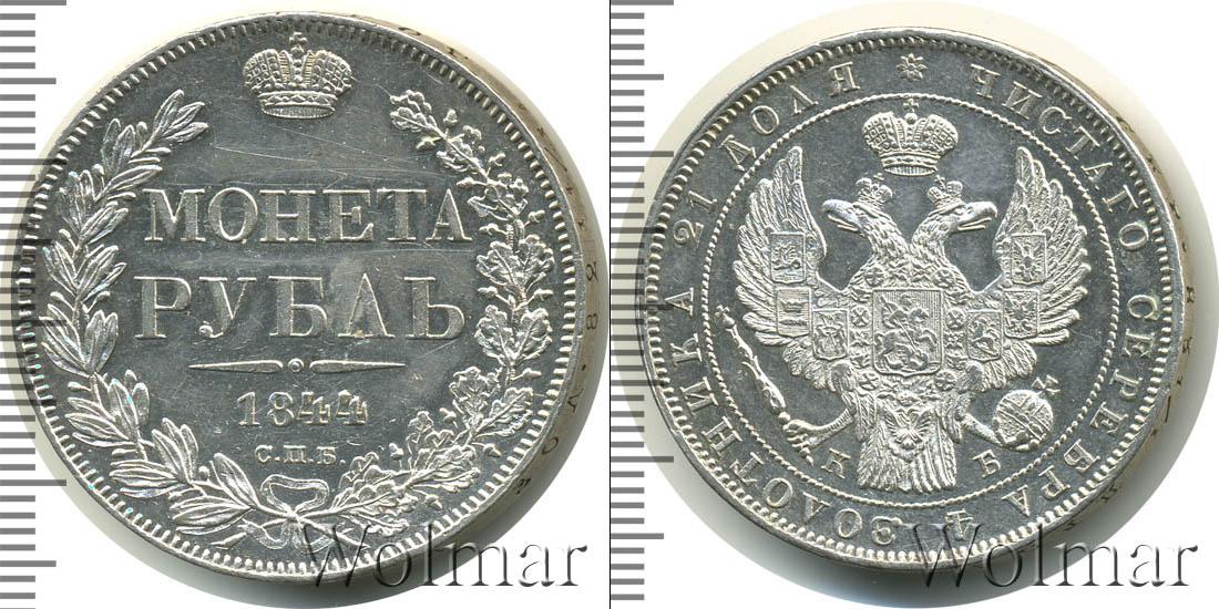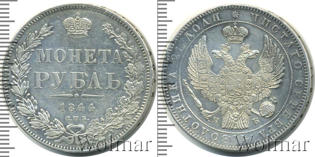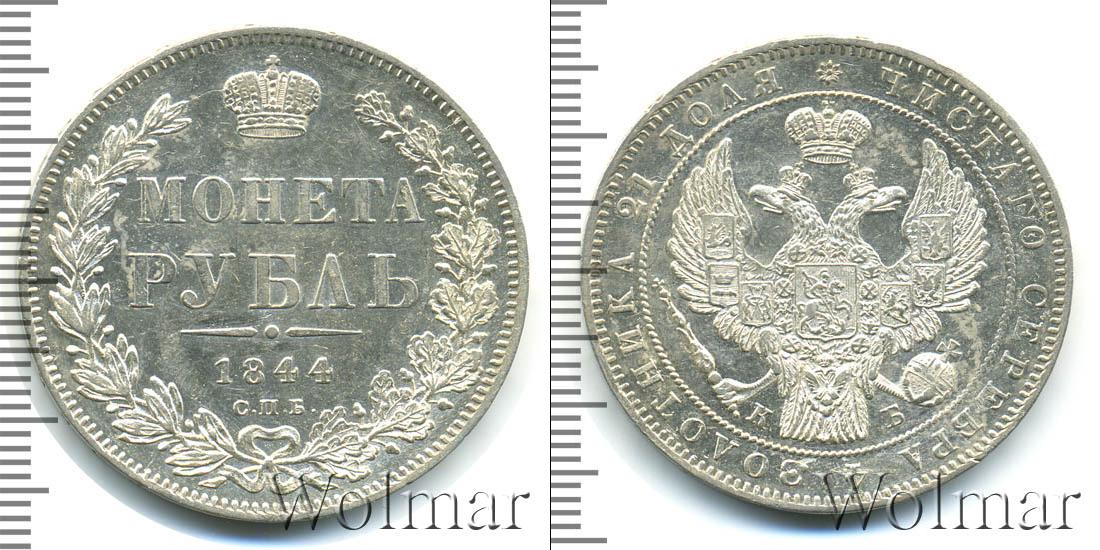 В центре оборота написан номинал «МОНЕТА РУБЛЬ». Под ним — геометрический орнамент, надписи «1844» и «С.П.Б.». В верхней части композиции выгравирована корона. От символа государственности расходятся ветки лавра и дуба, которые ниже связаны лентой.