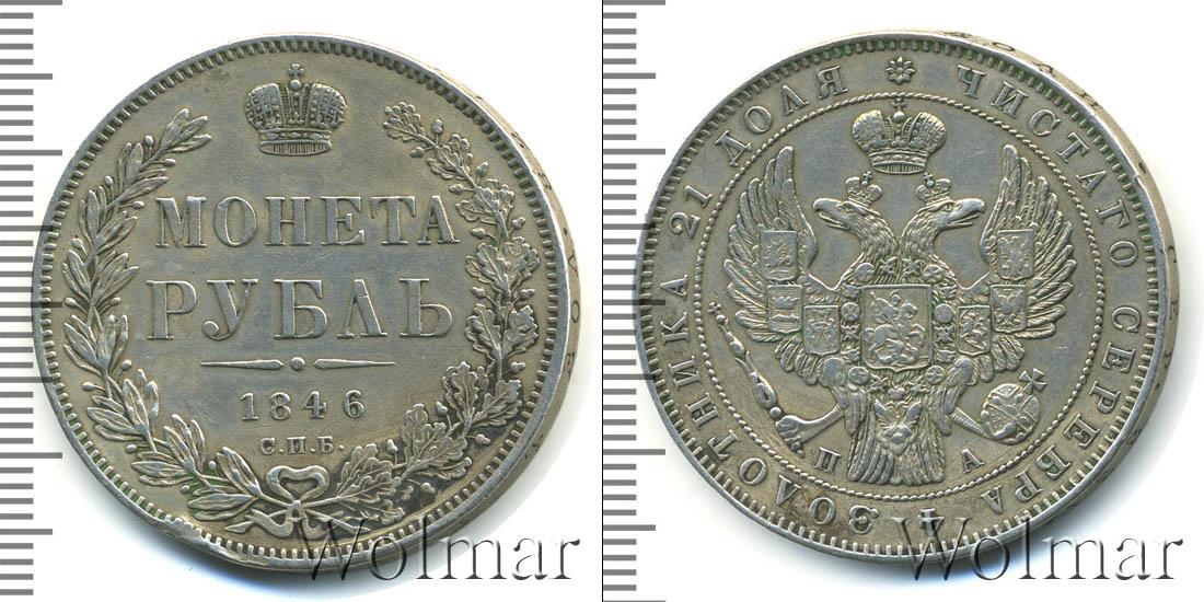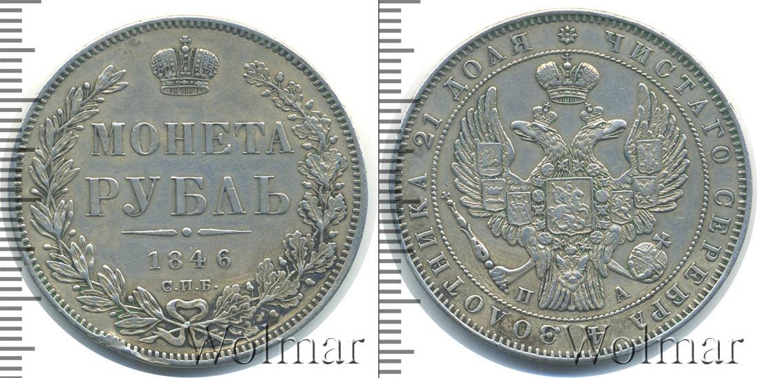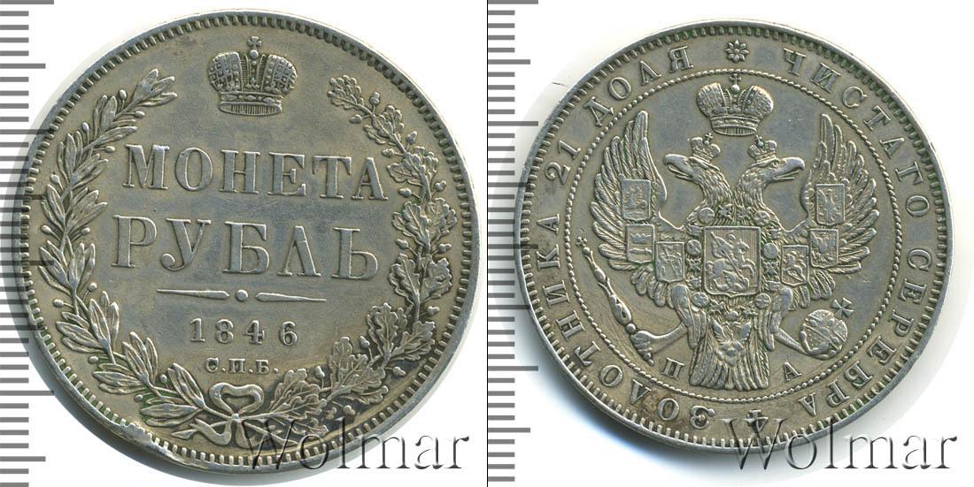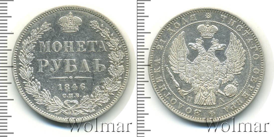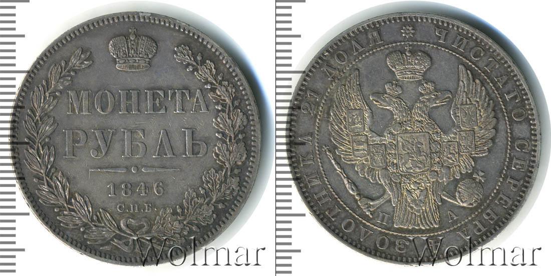 Имперская корона украшает легенду сверху. Под символом государственности указаны сведения об эмиссии. Горизонтальные надписи «МОНЕТА РУБЛЬ, 1846, С.П.Б.» с двух сторон огибают дубовая и лавровая ветки.