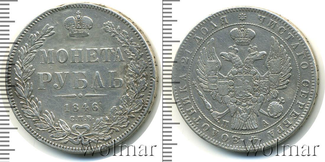 Имперская корона украшает легенду сверху. Под символом государственности указаны сведения об эмиссии. Горизонтальные надписи «МОНЕТА РУБЛЬ, 1846, С.П.Б.» с двух сторон огибают дубовая и лавровая ветки.