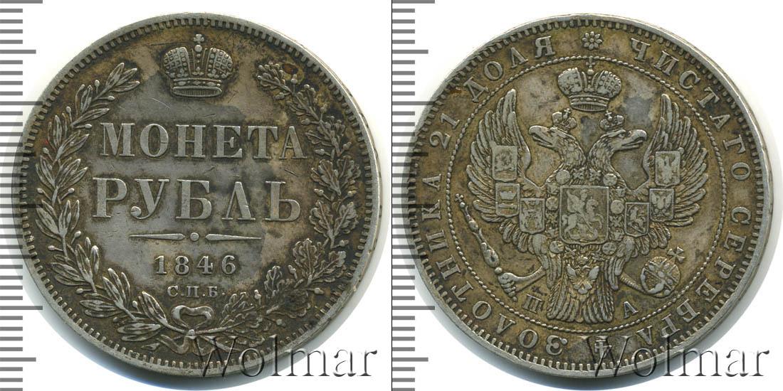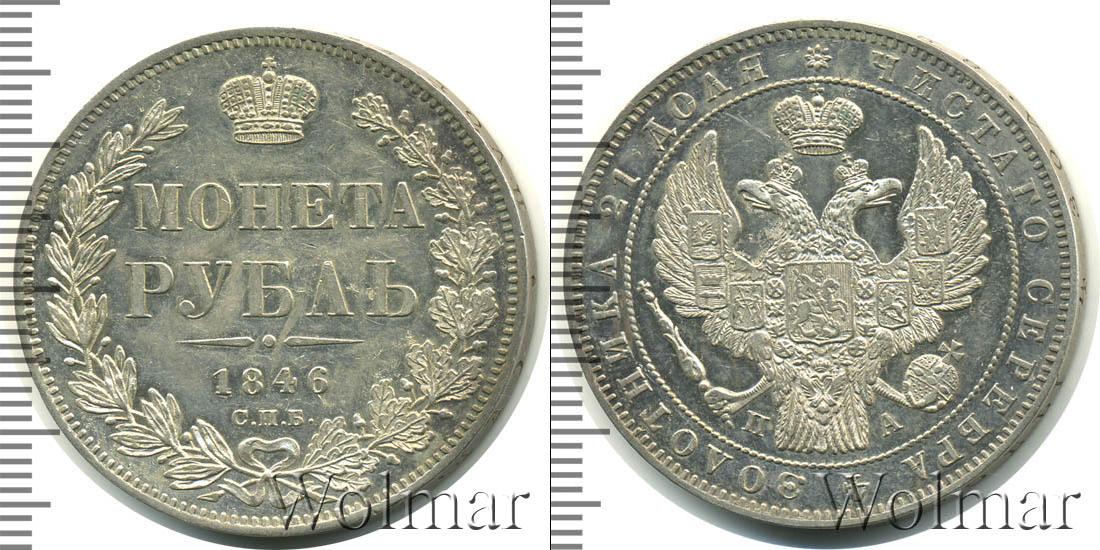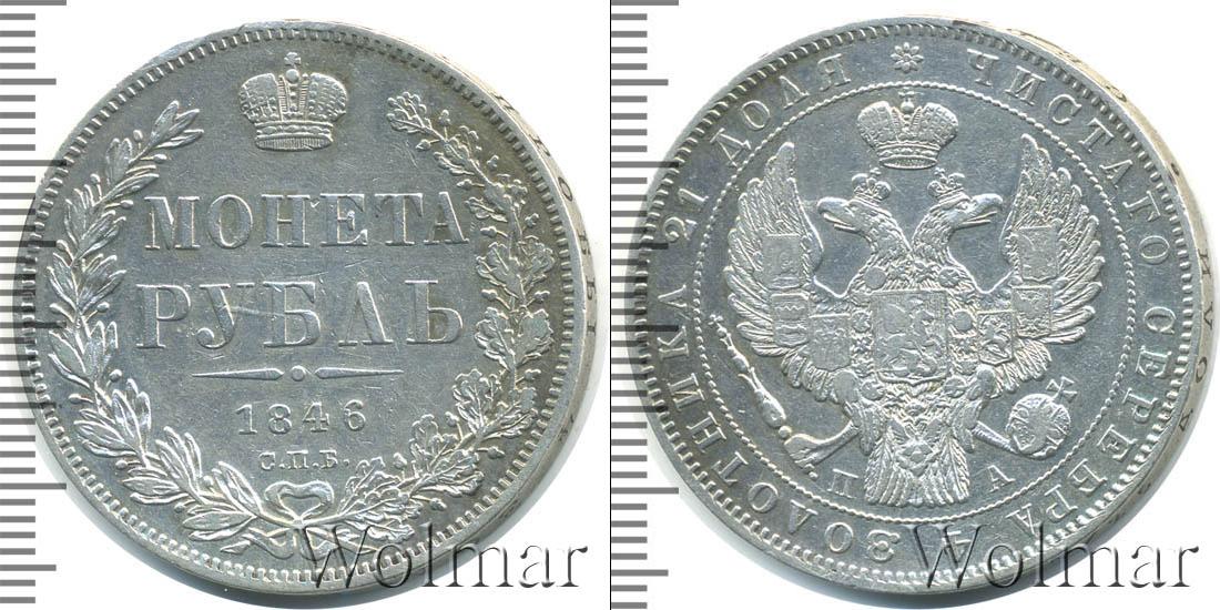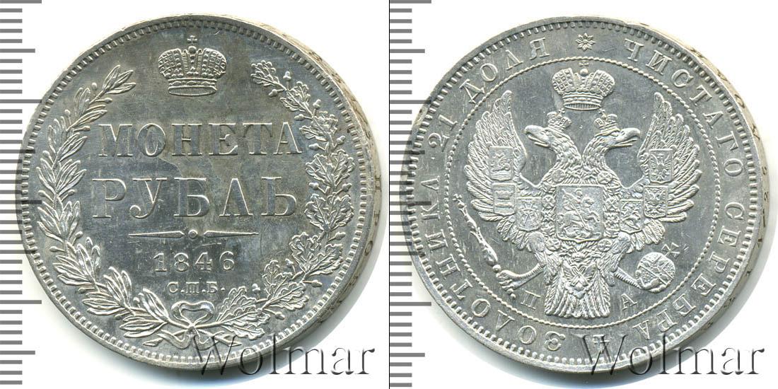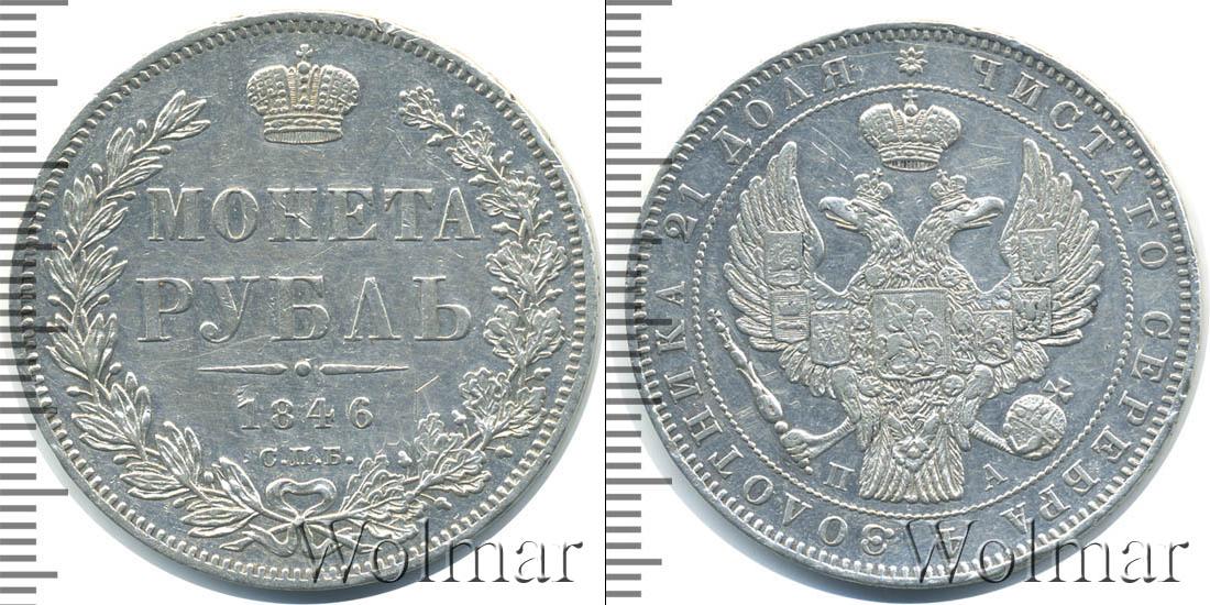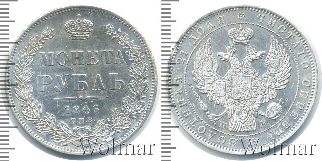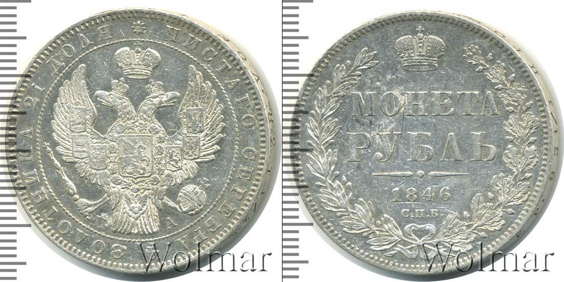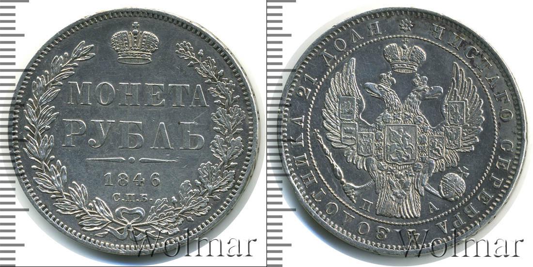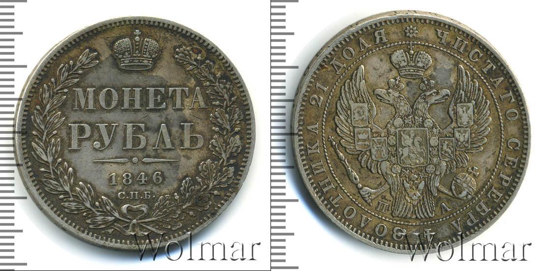 Имперская корона украшает легенду сверху. Под символом государственности указаны сведения об эмиссии. Горизонтальные надписи «МОНЕТА РУБЛЬ, 1846, С.П.Б.» с двух сторон огибают дубовая и лавровая ветки.