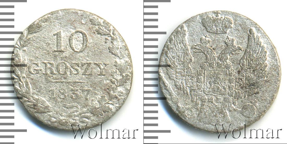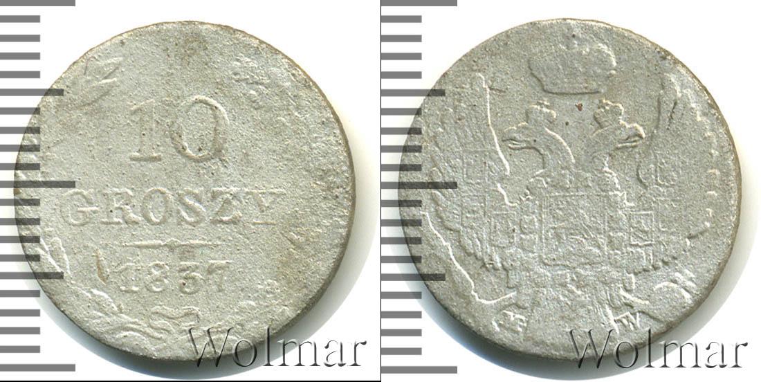 По краю монеты идет узор в виде лавровой и дубовой ветвей, переплетенных в нижней части лентой. Над лентой находится год эмиссии монеты «1837», а в центре отделенный от даты фигурным обрезом номинал монеты «10 GROSZY».