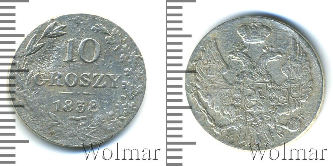 С оборотной стороны монеты указаны номинал и дата эмиссии партии: 10 GROSZY (польских грошей) 1838. Внизу растительный орнамент из лавровой и дубовой ветвей, перевязанных двойной лентой.