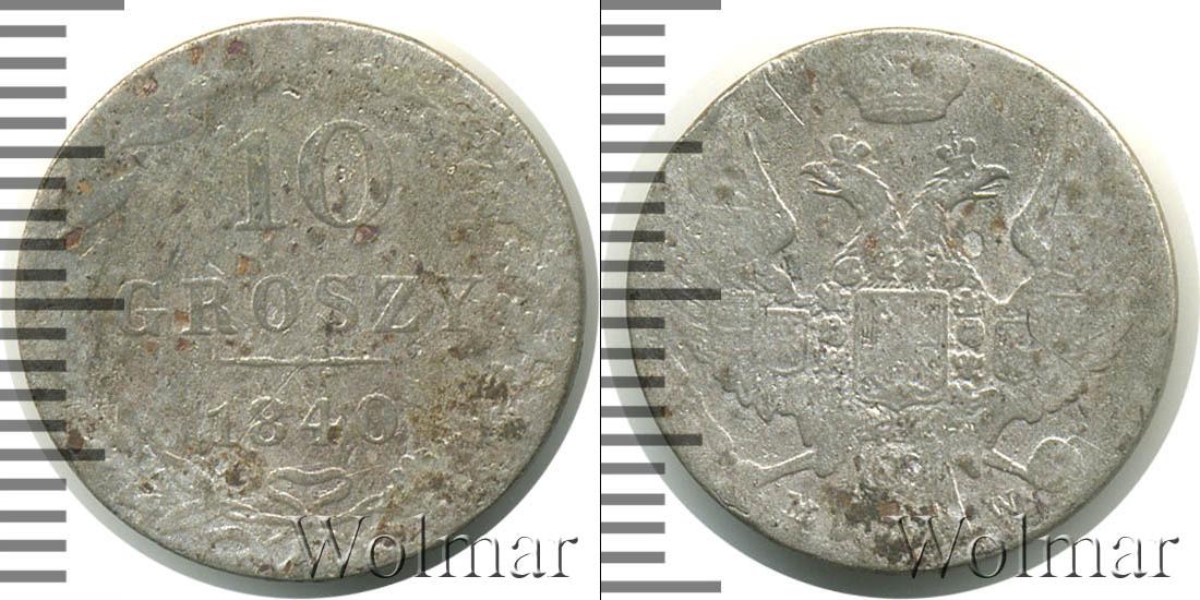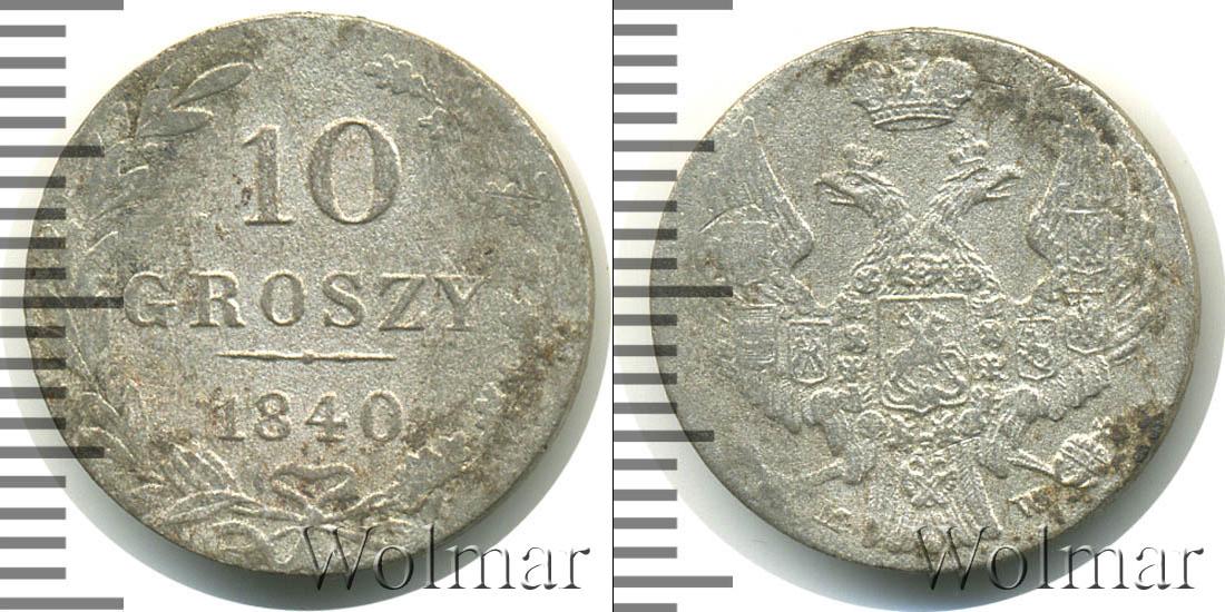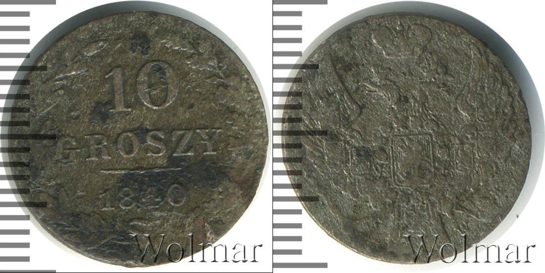 С оборотной стороны монеты указаны номинал и год выпуска партии: 10 GROSZY (десять польских грошей) 1840. Внизу мы видим лавровую и дубовую ветви, перевязанные двойной лентой.