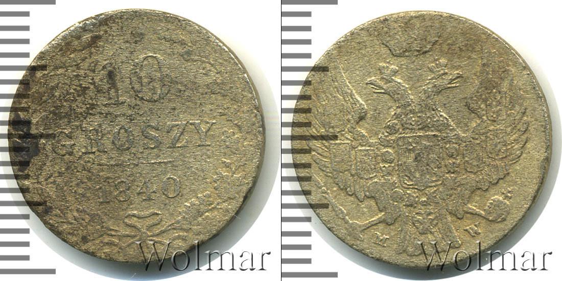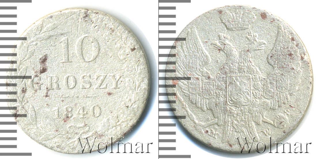 С оборотной стороны монеты указаны номинал и год выпуска партии: 10 GROSZY (десять польских грошей) 1840. Внизу мы видим лавровую и дубовую ветви, перевязанные двойной лентой.