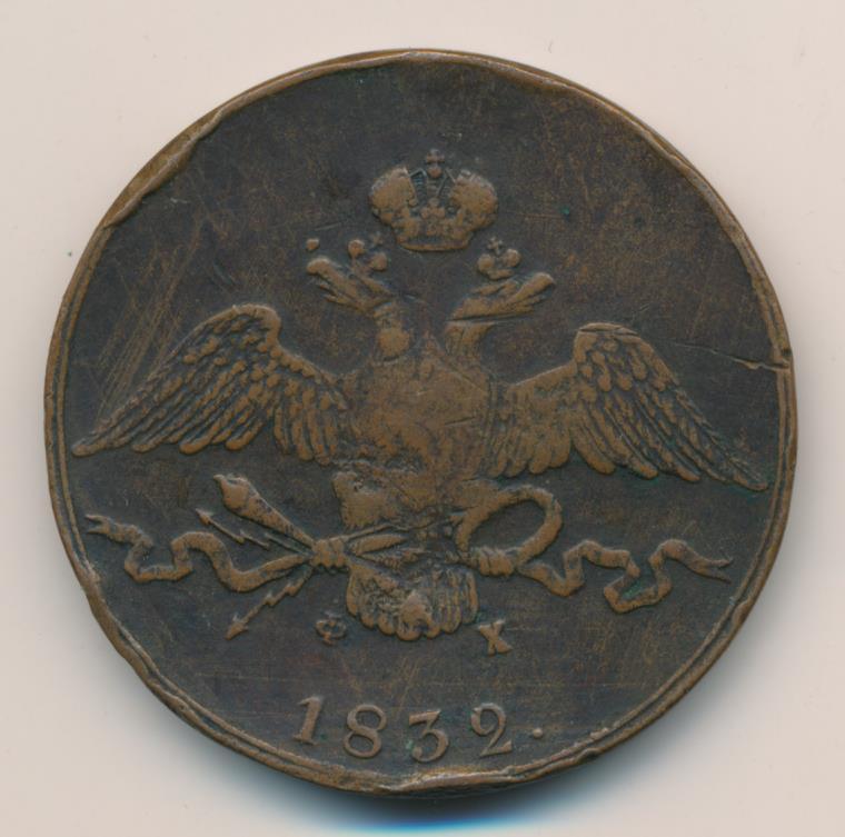 Большую часть диска занимает гербовый символ России (двуглавый орел с опущенными крыльями в императорской короне). Внизу обозначение минцмейстера Ф.Х., расшифровывается, как Федор Хвощинский. Также внизу расположена надпись: 1832.