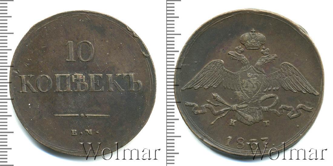 Сделаны отметки о номинале и месте чеканки партии медных монет: 10 КОПЕЕК Е.М. (Екатеринбургский монетный двор). Диск монеты украшен фигурной лентой с точкой посередине.