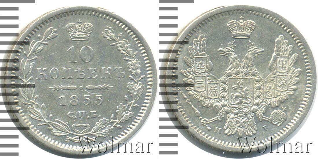 В центре композиции указан номинал «10 КОПЪЕКЪ» двумя строками. Ниже написан год эмиссии и оттиск товарного знака монетного двора «1855», «С.П.Б.». Имперская корона украшает верх диска.