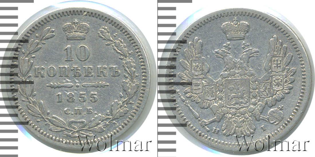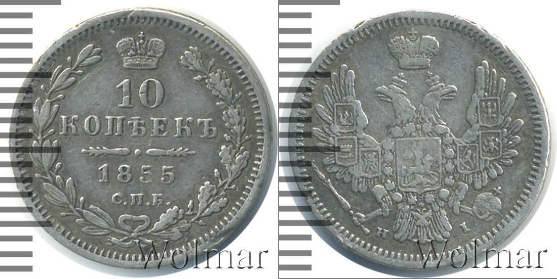 В центре композиции указан номинал «10 КОПЪЕКЪ» двумя строками. Ниже написан год эмиссии и оттиск товарного знака монетного двора «1855», «С.П.Б.». Имперская корона украшает верх диска.