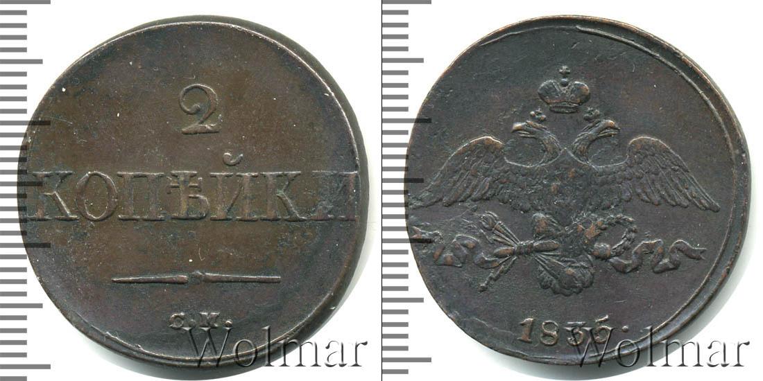 Медная монета массой 9,1 г. и диаметром 30 мм. По центру изображен двуглавый орел с гербом Москвы на груди, сжимающий меч, державу и скипетр. Это гербовая эмблема Российской Империи. Внизу указана дата эмиссии партии: 1835.