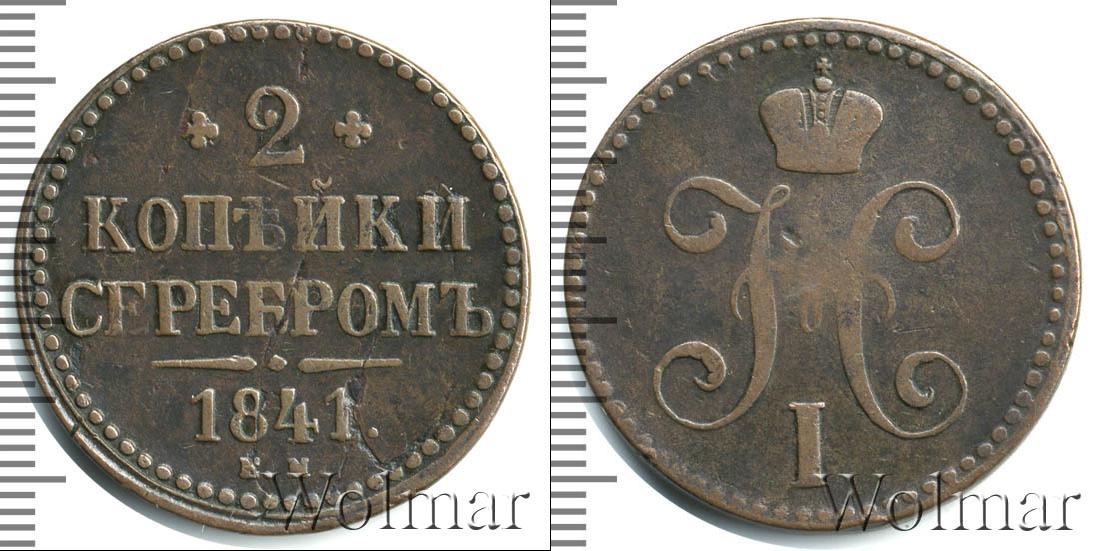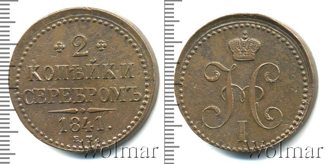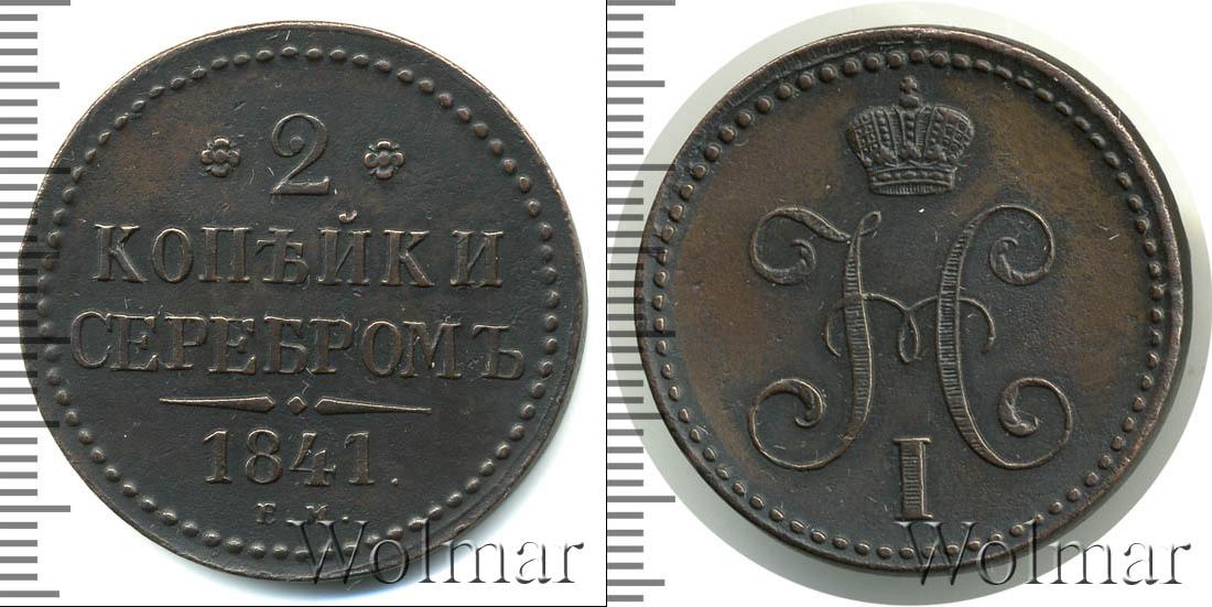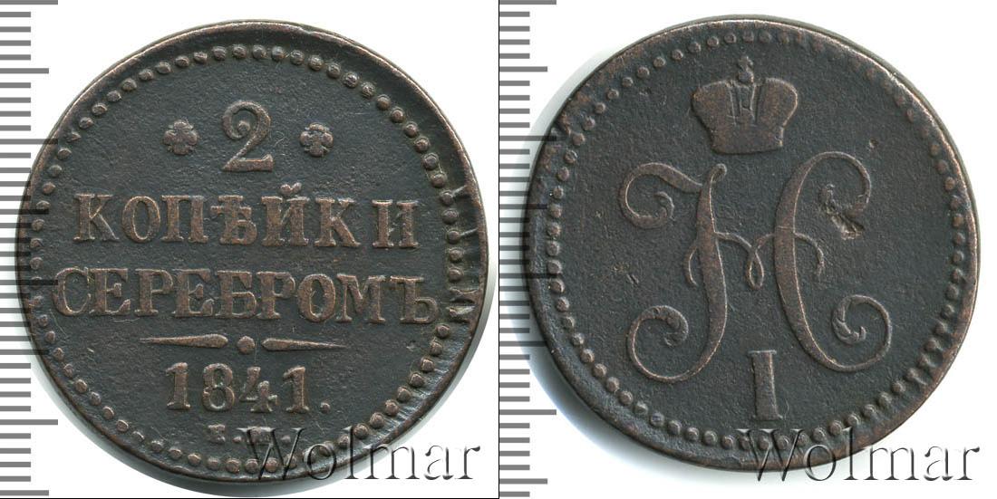 Расположена надпись (сверху вниз): 2 КОПЕЙКИ НА СЕРЕБРО 1841Е.М. Это номинал, дата эмиссии и монетный двор, где была отчеканена партия медных монет. По кругу – точечный ободок. Также диск монеты украшают две цветочные розетки и фигурная линия.