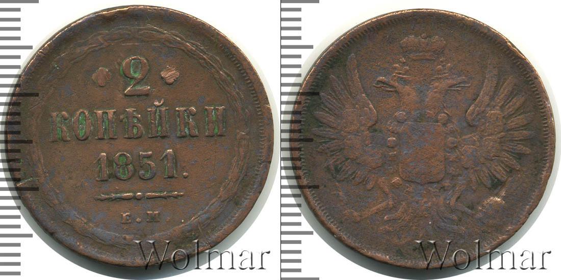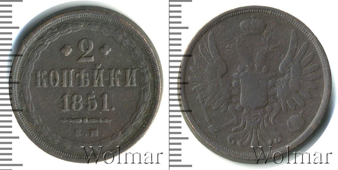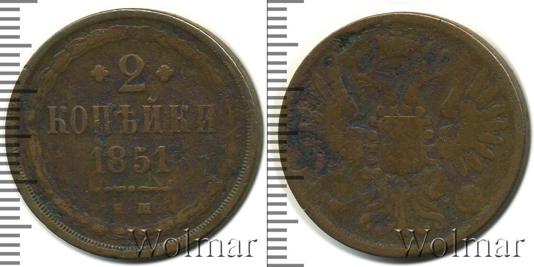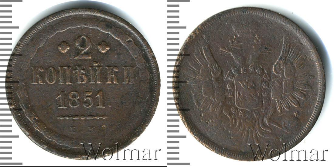 Вверху указание на номинал монеты: 2 КОПЕЙКИ. Ниже отмечены дата эмиссии и обозначение монетного двора Екатеринбурга «1851 Е.М.». По кругу расположен венок, крестообразно перевязанный лентами. Край диска аналогичен аверсу – зубчатый орнамент.