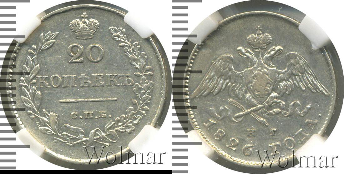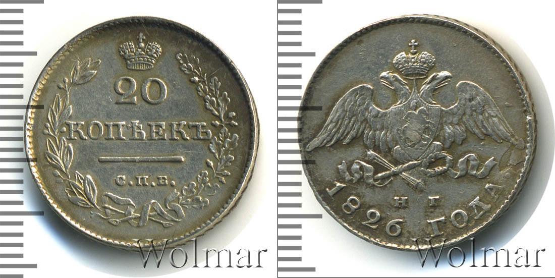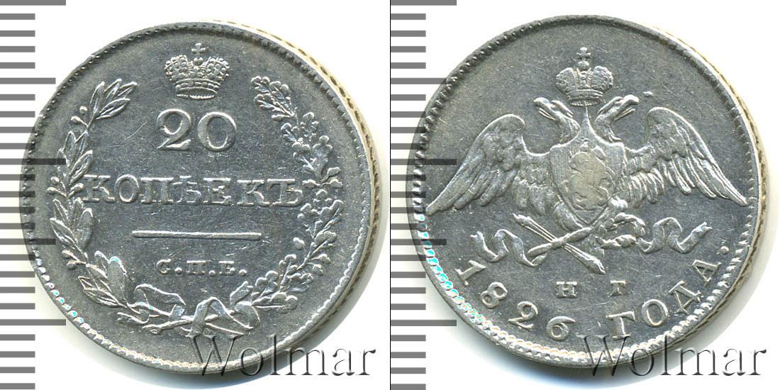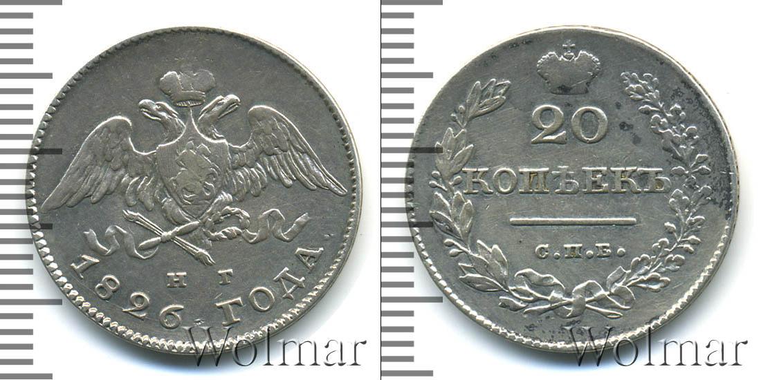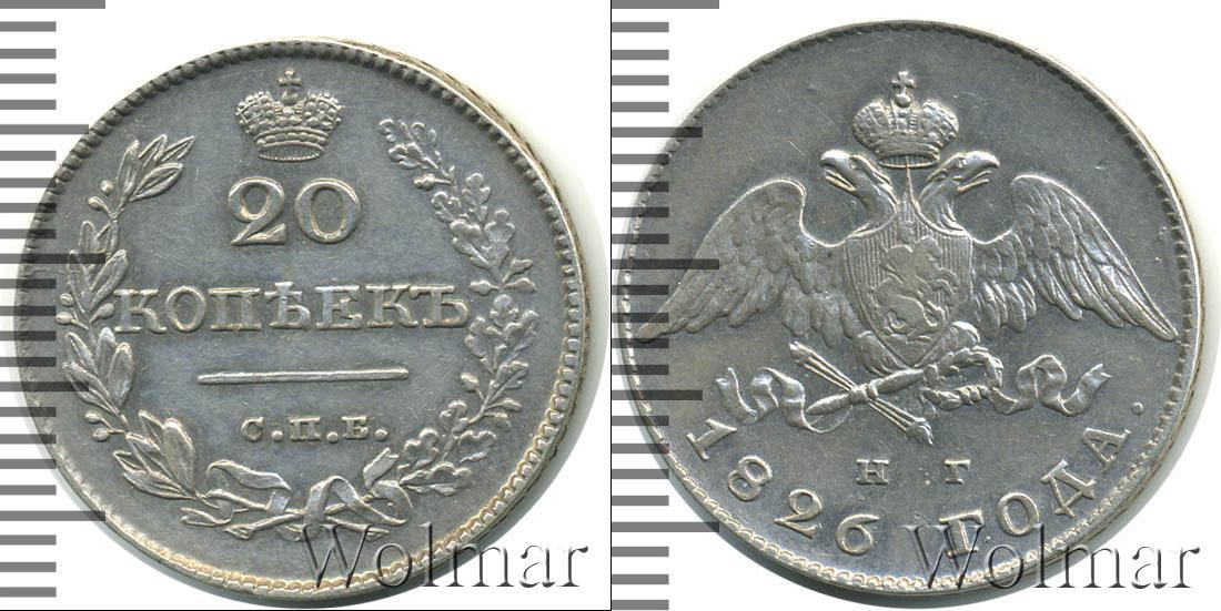 Серебряная монета массой 4,14 г. и диаметром 22 мм. По центру гербовое изображение Российской Империи (первая половина девятнадцатого века). Внизу отмечены инициалы минцмейстера – «Н.Г.». Ниже полукругом гравировка: 1826 ГОДА.