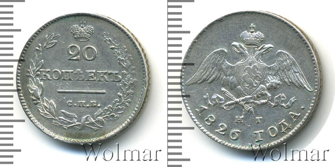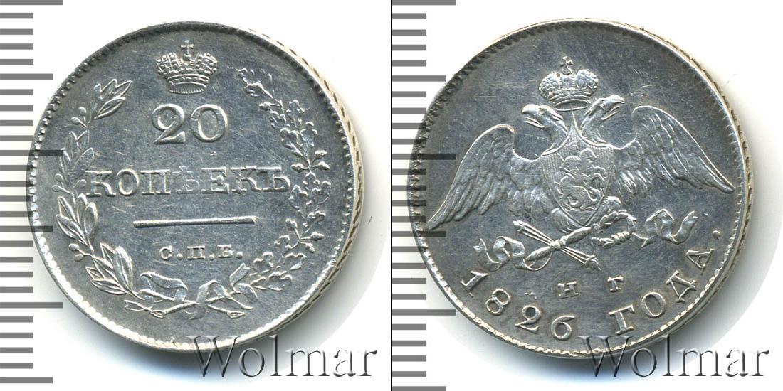 Серебряная монета массой 4,14 г. и диаметром 22 мм. По центру гербовое изображение Российской Империи (первая половина девятнадцатого века). Внизу отмечены инициалы минцмейстера – «Н.Г.». Ниже полукругом гравировка: 1826 ГОДА.