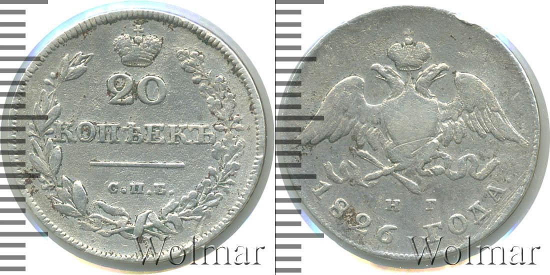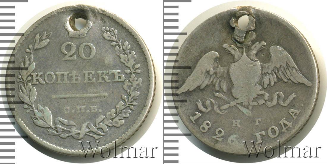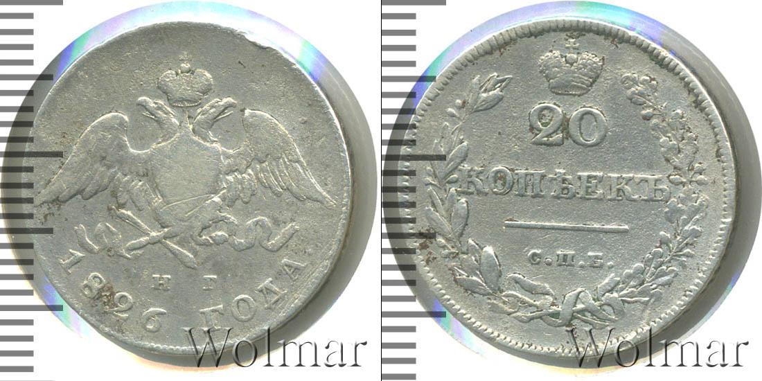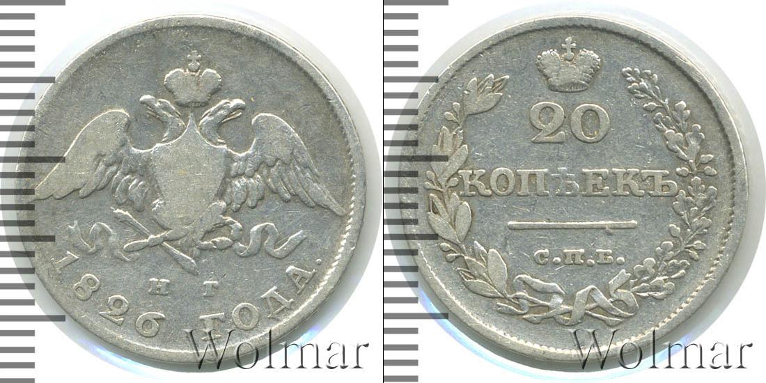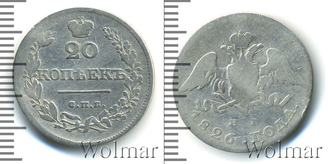 Серебряная монета массой 4,14 г. и диаметром 22 мм. По центру гербовое изображение Российской Империи (первая половина девятнадцатого века). Внизу отмечены инициалы минцмейстера – «Н.Г.». Ниже полукругом гравировка: 1826 ГОДА.