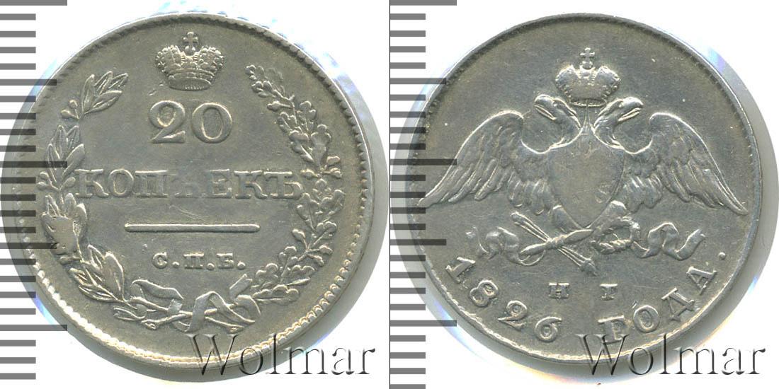 Серебряная монета массой 4,14 г. и диаметром 22 мм. По центру гербовое изображение Российской Империи (первая половина девятнадцатого века). Внизу отмечены инициалы минцмейстера – «Н.Г.». Ниже полукругом гравировка: 1826 ГОДА.