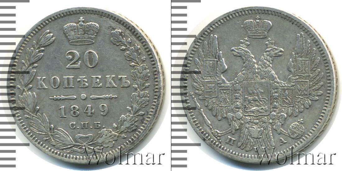 Надпись сверху вниз: «20 КОПЕЕК 1849 С.П.Б». Вверху детально показана Императорская корона России. Диск монеты украшен зубчатым орнаментом, фигурной линией, а также лавровой и дубовой ветвями (слева и справа, внизу).