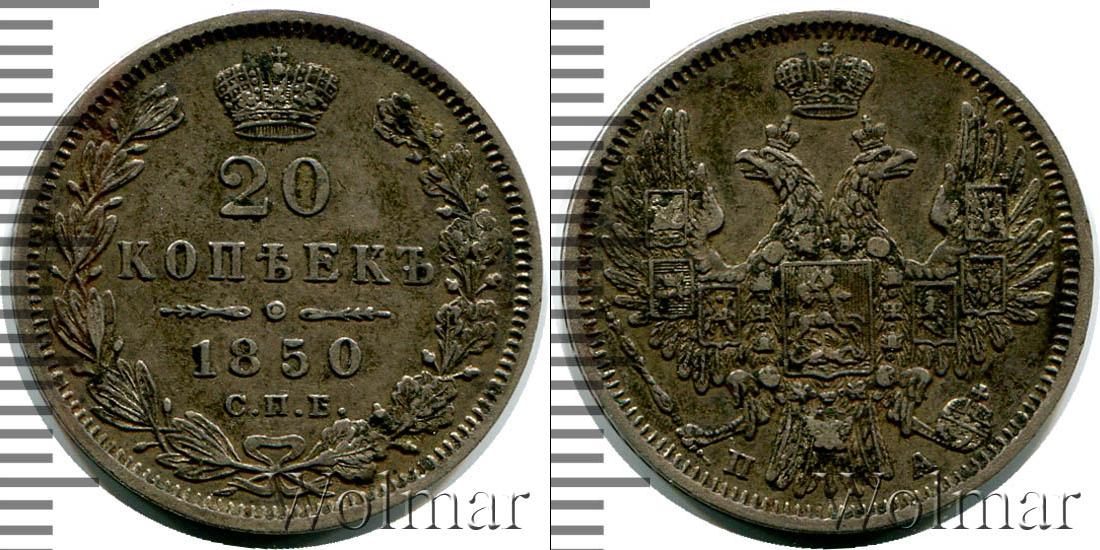 В верхней части монеты изображена Корона Российской Империи, по краю идет узор в виде маленьких штрихов. В верхней половине монеты отчеканен номинал «20 КОПЕЕК», в нижней половине, отделенной фигурной чертой, выгравированы год эмиссии «1850» и инициалы монетного двора «С.П.Б.». Слева и справа полукругом изображены лавровая и дубовая ветви, перевязанные внизу с помощью ленты.