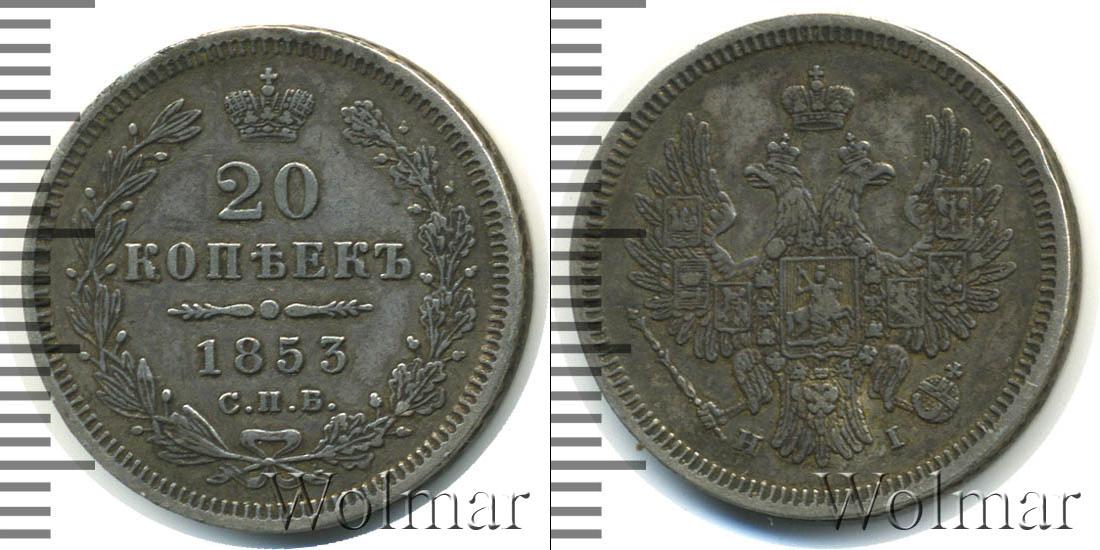 Царапина. Санкт-Петербургский монетный двор. Биткин №# 815.344, "орёл образца 1854-1858", тираж 1 800 005, Уздеников №# 1709. По каталогу Wolmar # 123/30. 20 копеек СПБ НI