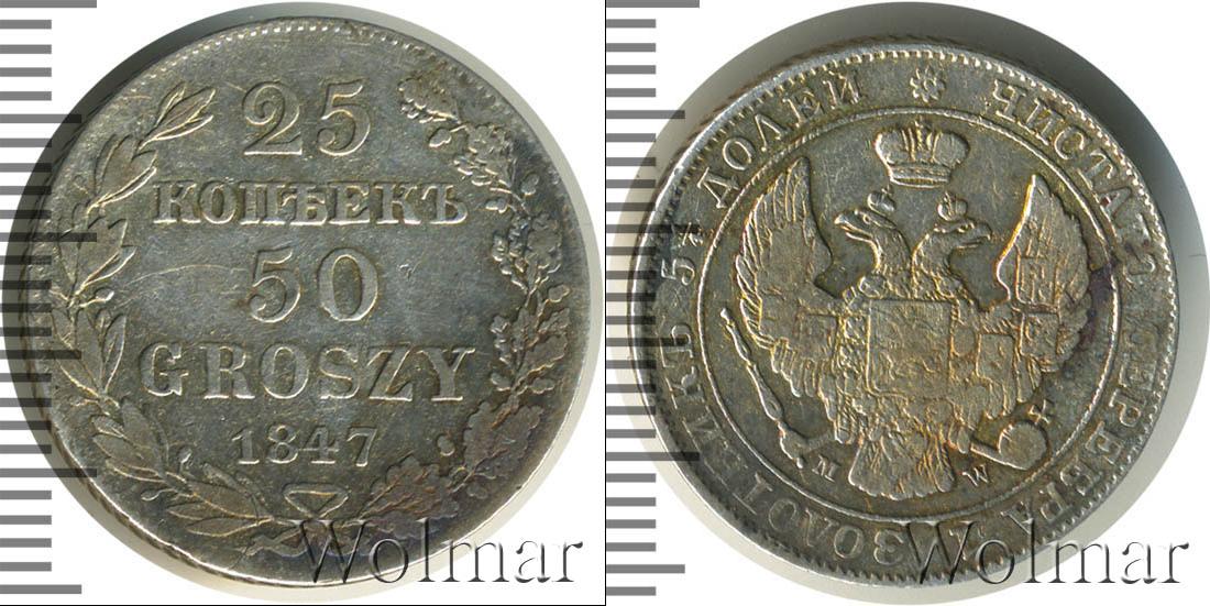 Цена монеты 25 копеек—50 грошей 1847 года в городе Москва на сегодня, 03 ноября 2025 года