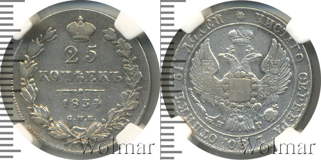По центру начертано: 25 КОПЕЕК 1834 С.П.Б. Венчает надпись Императорская корона России. В нижней части диска находится изображение лавровой и дубовой ветвей, перетянутых внизу узорчатой лентой. Около указания на монетный двор - фигурная черта.