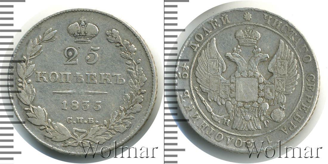 Большую часть диска занимают выпуклые изображения лавровой и дубовой ветвей, перевязанных лентой, Императорской короны России. В центре сделаны отметки: 25 КОПЕЕК 1835 С.П.Б. Год выпуска партии и указание на монетный двор разделяет фигурная черта с точкой посередине.