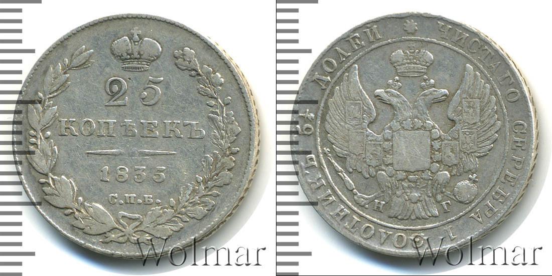 Большую часть диска занимают выпуклые изображения лавровой и дубовой ветвей, перевязанных лентой, Императорской короны России. В центре сделаны отметки: 25 КОПЕЕК 1835 С.П.Б. Год выпуска партии и указание на монетный двор разделяет фигурная черта с точкой посередине.