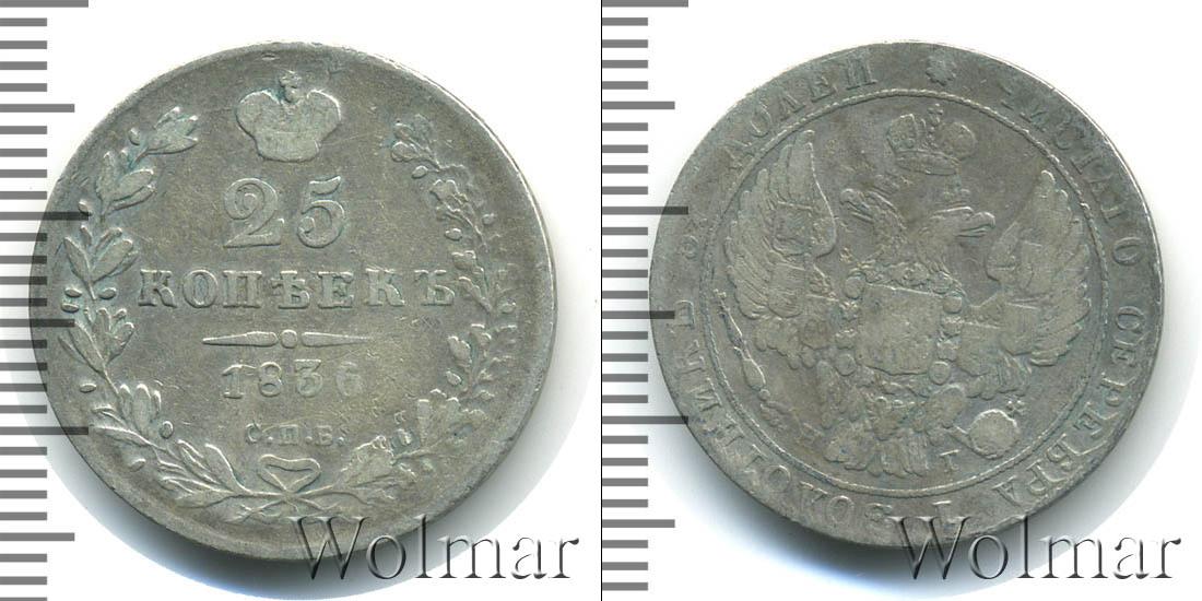 Растительный узор в нижней части диска. Вверху мы видим Императорскую корону России. Ниже в четыре строки надпись: 25 КОПЕЕК 1836 С.П.Б. Также на диске есть фигурная линия около отметки о монетном дворе Санкт-Петербурга.