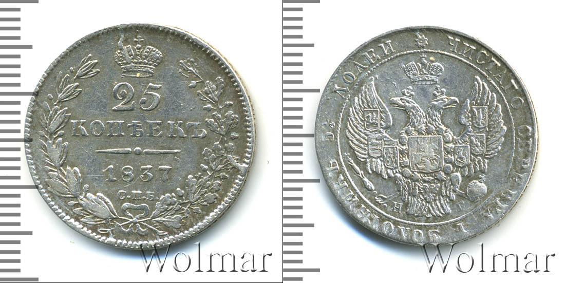 С этой стороны монеты диск украшают Императорская корона России, зубчатый узор вдоль канта (как и с лицевой стороны), а также символическое изображение лавровой и дубовой ветвей. По центру отмечен номинал, дата эмиссии и монетный двор, где была отчеканена эта партия: 25 КОПЕЕК 1837 С.П.Б.