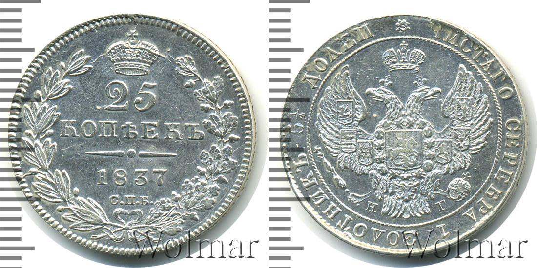 С этой стороны монеты диск украшают Императорская корона России, зубчатый узор вдоль канта (как и с лицевой стороны), а также символическое изображение лавровой и дубовой ветвей. По центру отмечен номинал, дата эмиссии и монетный двор, где была отчеканена эта партия: 25 КОПЕЕК 1837 С.П.Б.