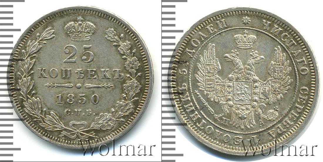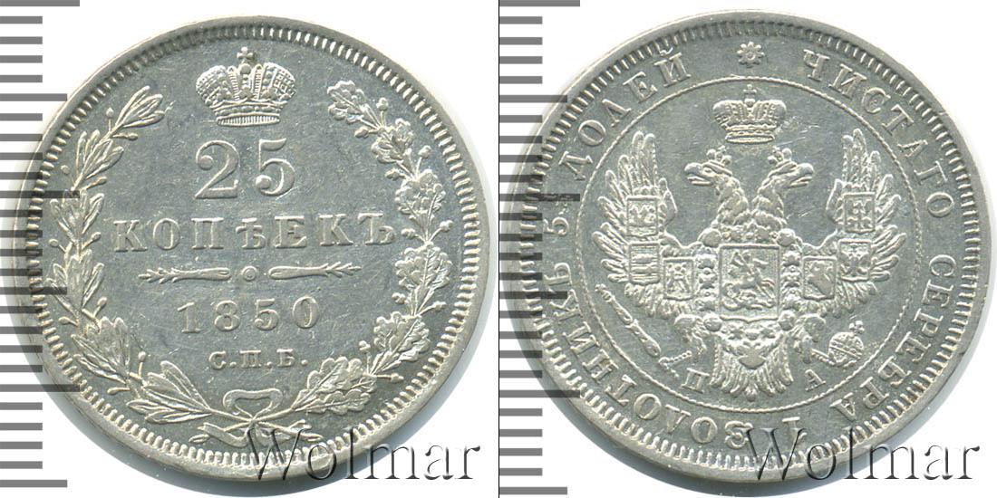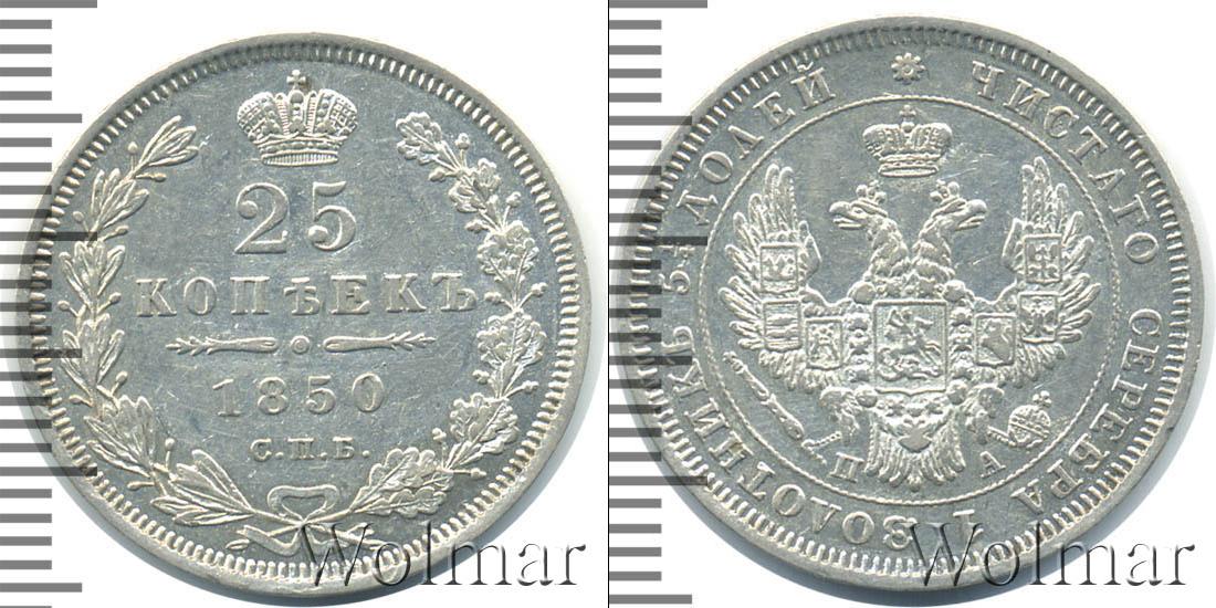 С оборотной стороны монеты выпуклые изображения лавровой и дубовой ветвей, перевязанных лентой, а также Императорской короны России. В центре сделаны отметки: 25 КОПЕЕК 1850 С.П.Б. Дату эмиссии и указание на монетный двор разделяет фигурная черта с точкой посередине.