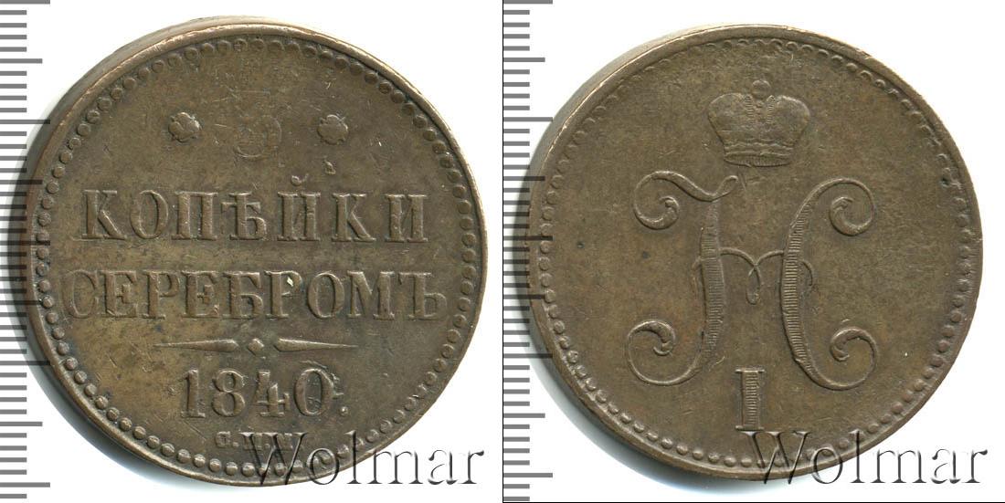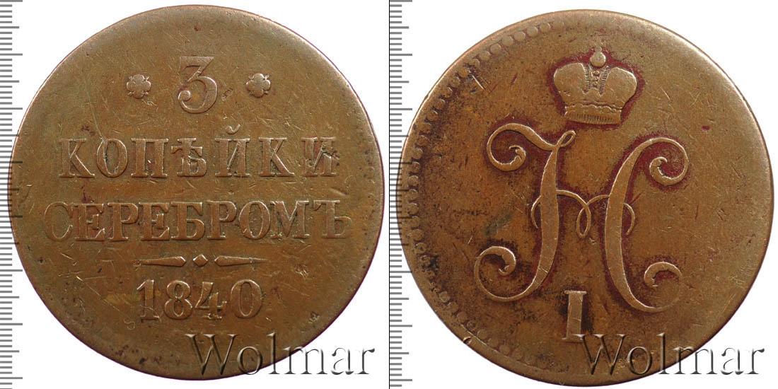 Геометрический узор вместо канта очерчивает периметр диска. Вверху легенды написана римская цифра «3». С двух сторон она украшена двумя небольшими цветками. Под указанием достоинства продолжение номинала «КОПЪЙКИ СЕРЕБРОМЪ». Пунктирная линия нарисована горизонтально. Под ней указан год эмиссии и товарный знак монетного двора: «1840», «Е. М.».