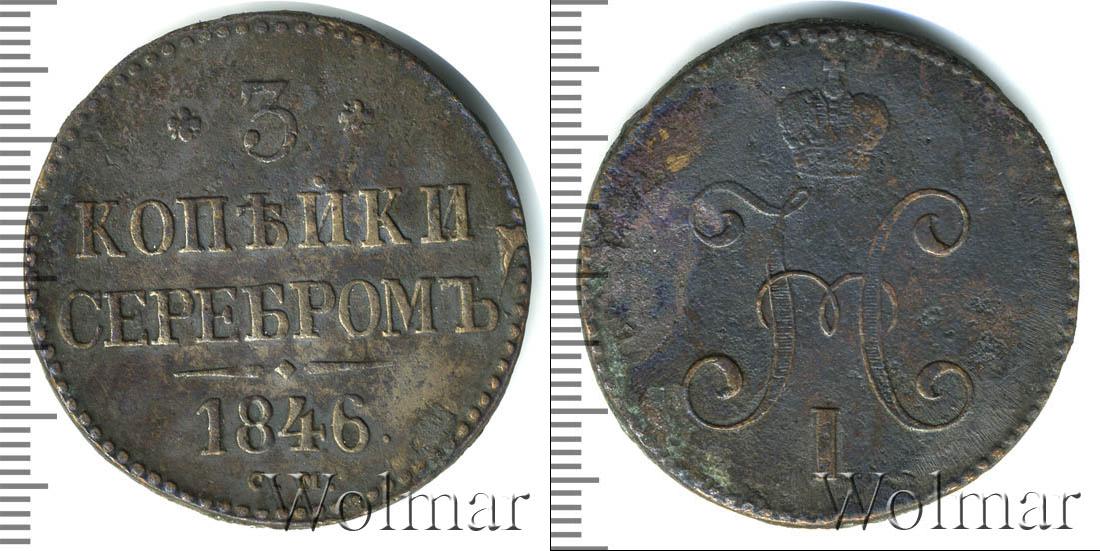 С этой стороны монеты мы видим надпись: 3 КОПЕЙКИ НА СЕРЕБРО 1846 С.М. Она занимает большую часть диска. Монета 1846 года номиналом 3 копейки; отчеканена на Сузунском монетном дворе. По краю расположен узор из множества точек.