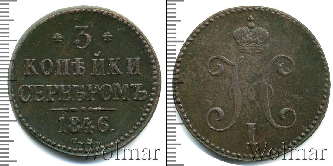С этой стороны монеты мы видим надпись: 3 КОПЕЙКИ НА СЕРЕБРО 1846 С.М. Она занимает большую часть диска. Монета 1846 года номиналом 3 копейки; отчеканена на Сузунском монетном дворе. По краю расположен узор из множества точек.
