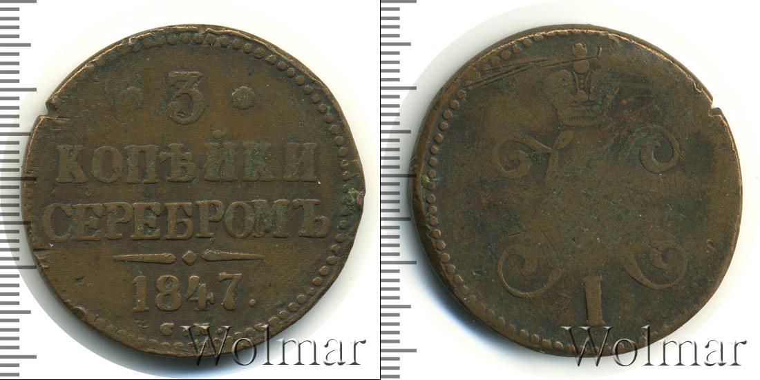 Край диска оформлен аналогично аверсу – точечный ободок. В центре указаны номинал и год выпуска партии: 3 КОПЕЙКИ СЕРЕБРОМ 1847. Внизу начертано: С.М. Это обозначение Сузунского монетного двора. Диск монеты украшают две цветочные розетки и фигурная черта с точкой.