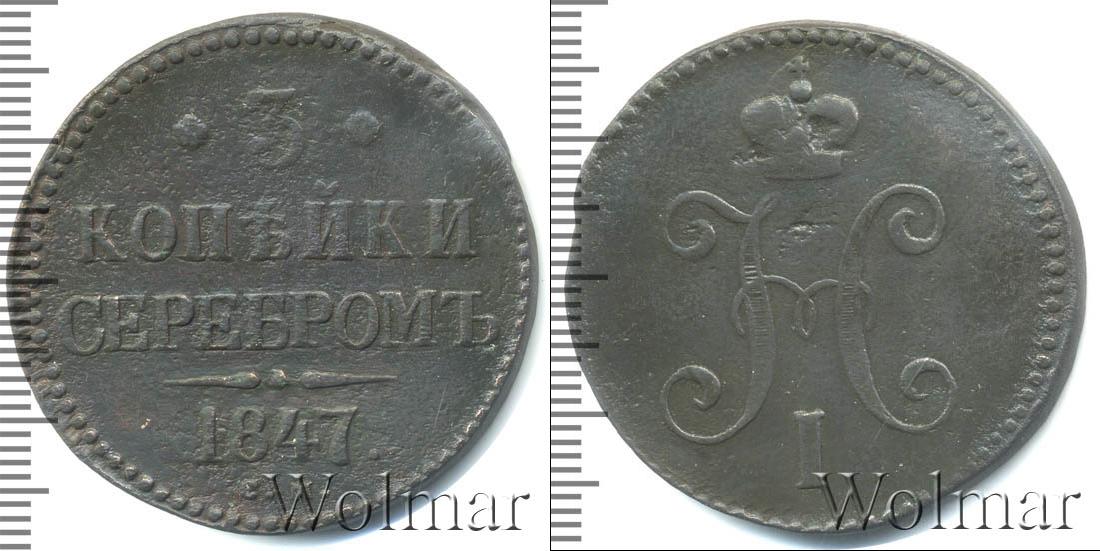 Край диска оформлен аналогично аверсу – точечный ободок. В центре указаны номинал и год выпуска партии: 3 КОПЕЙКИ СЕРЕБРОМ 1847. Внизу начертано: С.М. Это обозначение Сузунского монетного двора. Диск монеты украшают две цветочные розетки и фигурная черта с точкой.