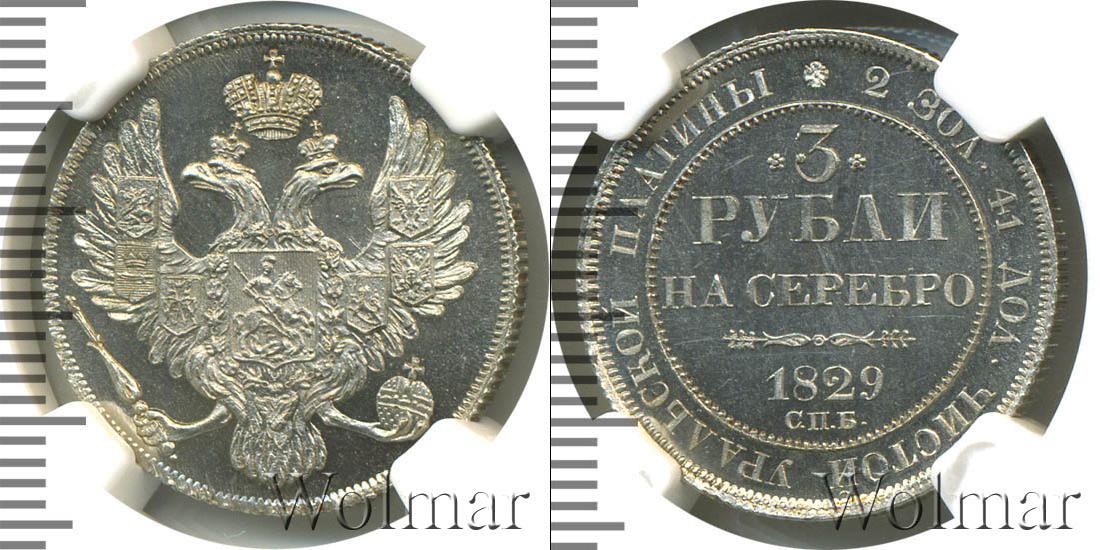 Вдоль канта идет зубчатый узор. Рядом начертано: 2 ЗОЛ. 41 ДОЛ. ЧИСТОЙ УРАЛЬСКОЙ ПЛАТИНЫ. По середине указаны номинал, год выпуска монеты и Санкт-Петербургский монетный двор: 3 РУБЛЯ НА СЕРЕБРО 1829 С.П.Б.