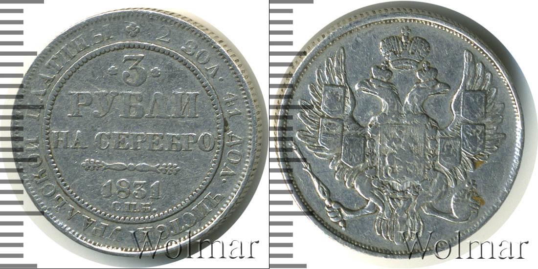 С оборотной стороны монеты сделаны отметки о номинале, дате эмиссии и монетном дворе, где была отчеканена эта партия: 3 РУБЛЯ НА СЕРЕБРО 1831 С.П.Б. Также вдоль канта идет надпись с характеристиками монеты: 2 ЗОЛ. 41 ДОЛ. ЧИСТОЙ УРАЛЬСКОЙ ПЛАТИНЫ. Край диска оформлен идентично реверсу. Между номиналом и обозначением С.П.Б. – фигурная линия.