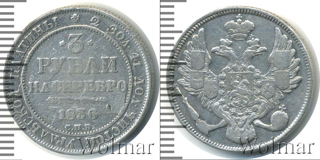 Сделаны отметки о номинале, дате эмиссии и монетном дворе, где была отчеканена эта партия: 3 РУБЛЯ НА СЕРЕБРО 1836 С.П.Б. Также вдоль канта идет надпись с характеристиками монеты: 2 ЗОЛ. 41 ДОЛ. ЧИСТОЙ УРАЛЬСКОЙ ПЛАТИНЫ. Край диска оформлен идентично реверсу. Между номиналом и обозначением С.П.Б. – фигурная линия.