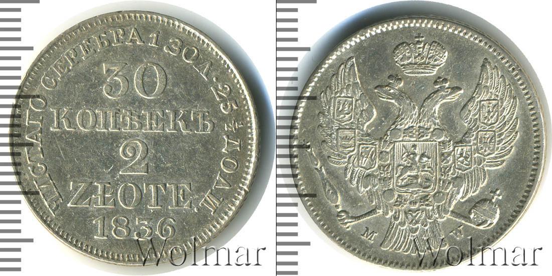 Кант представлен геометрическим орнаментом. Вдоль него радиально написано «ЧИСТАГО СЕРЕБРА 1 ЗОЛ 25 ? ДОЛИ». Центр легенды содержит данные об эмиссии. Верхняя строка номинала – «30», под ней написано «КОПЪЕКЪ». Ниже указан денежный эквивалент в польской валюте «2 ZLOTE». Год чекана выгравирован нижней строкой «1836».