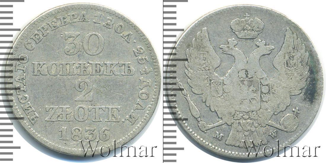 Кант представлен геометрическим орнаментом. Вдоль него радиально написано «ЧИСТАГО СЕРЕБРА 1 ЗОЛ 25 ? ДОЛИ». Центр легенды содержит данные об эмиссии. Верхняя строка номинала – «30», под ней написано «КОПЪЕКЪ». Ниже указан денежный эквивалент в польской валюте «2 ZLOTE». Год чекана выгравирован нижней строкой «1836».