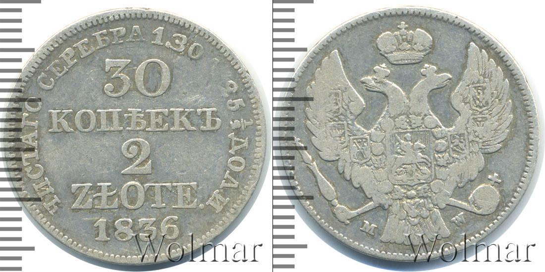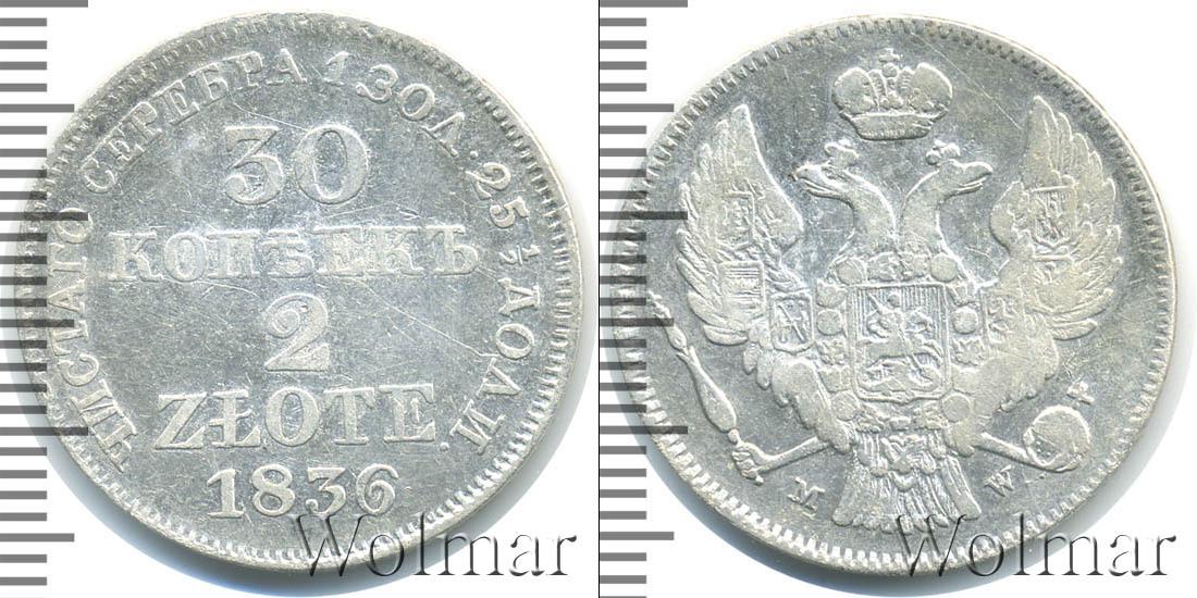 Варшавский монетный двор. Биткин №# 862.1153, тираж 2 589 406, Уздеников №# 4116. По каталогу Wolmar # 438/3. 30 копеек - 2 злотых MW