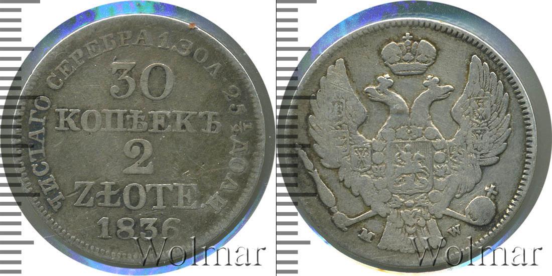 Кант представлен геометрическим орнаментом. Вдоль него радиально написано «ЧИСТАГО СЕРЕБРА 1 ЗОЛ 25 ? ДОЛИ». Центр легенды содержит данные об эмиссии. Верхняя строка номинала – «30», под ней написано «КОПЪЕКЪ». Ниже указан денежный эквивалент в польской валюте «2 ZLOTE». Год чекана выгравирован нижней строкой «1836».