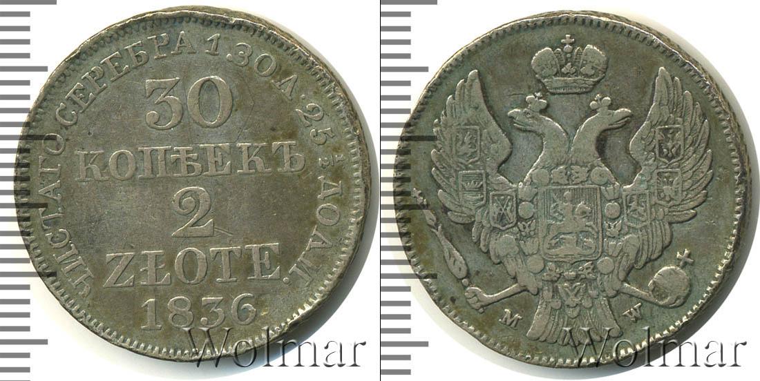 Цена монеты 30 копеек—2 злотых 1836 года в городе Москва на сегодня, 03 января 2026 года