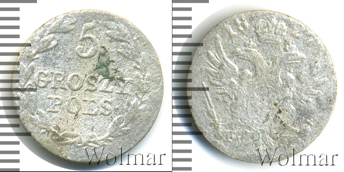 Большую часть диска монеты занимает растительный орнамент внизу (лавровая и дубовая ветви, перевязанные двойной лентой). Сверху вниз расположена надпись: 5 GROSZY POLS (польских грошей).