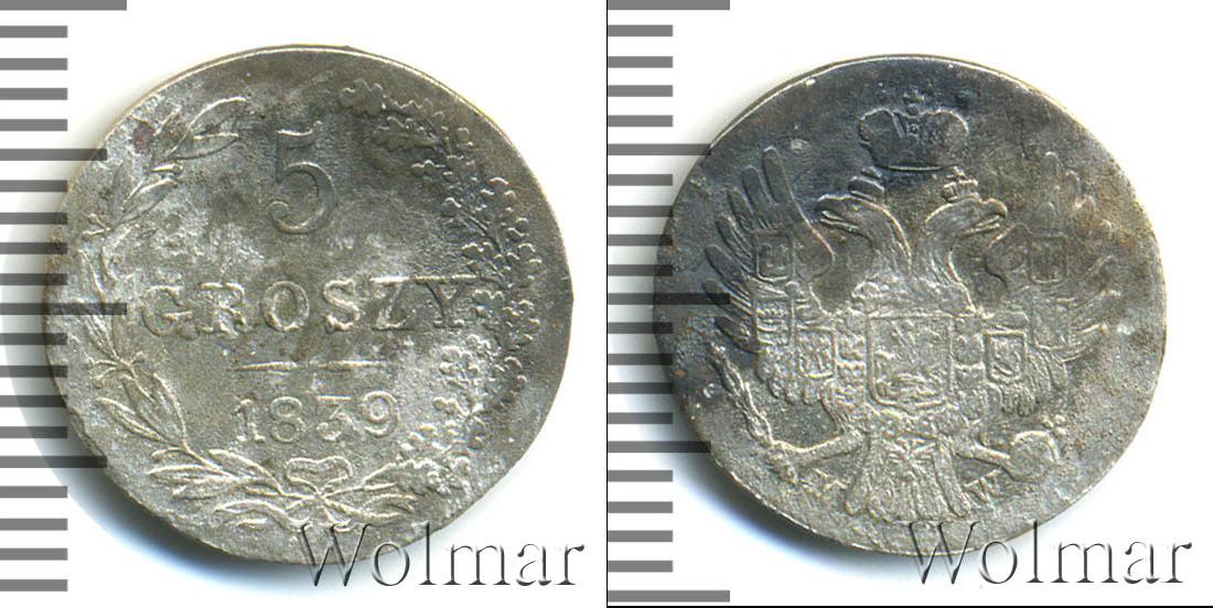 С этой стороны монеты мы видим растительный узор (лавровая и дубовая ветви, перевязанные двойной лентой). Также сделаны отметки о номинале и дате эмиссии партии. По центру начертано: 5 GROSZY» (фигурная черта, разделенная точкой) 1839.