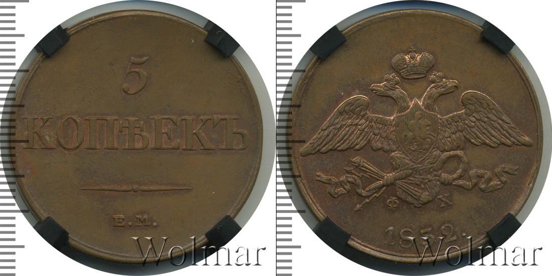 «Е.М.» расположено внизу легенды. Над символом монетного двора нарисован геометрический орнамент. Штрихпунктирная линия подчеркивает номинал. «5 КОПЪЕКЪ» написано горизонтально заглавными буквами крупным шрифтом.