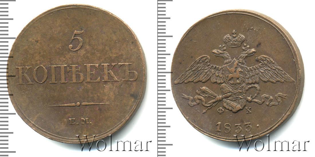 В центре легенды симметрично нарисован двуглавый орел. В лапах птицы расположены: лавровый венок, громовые стрелы и факел. С двух сторон от хвоста развевается лента ордена Святого Апостола Андрея Первозванного. Головы геральдического символа Российской Империи украшены имперской короной. Год тиража «1833» написан радиально вдоль нижнего полукруга. Инициалы минцмейстера «ФХ» указаны под лапами.