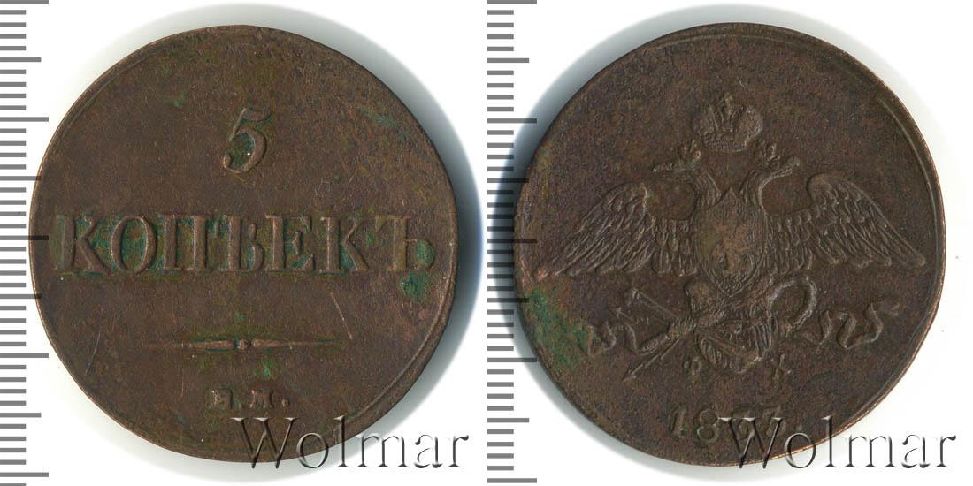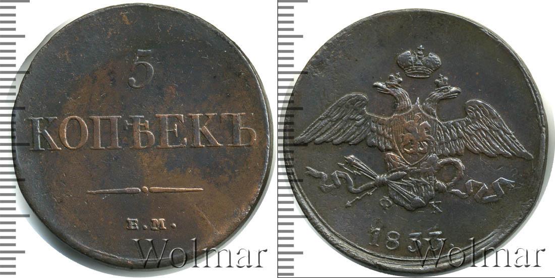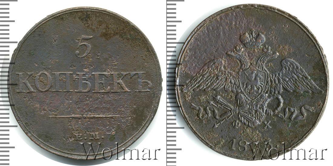Гладкая поверхность диска условно поделена на две части. Штрихпунктирная линия делит круг на неравные части. В верхнем сегменте указан номинал «5 КОПЪЕКЪ», в нижнем – товарный знак монетного двора «Е.М.».