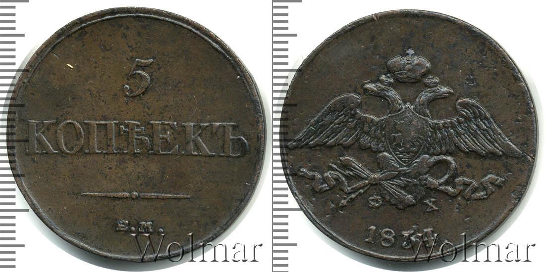 Горизонтальный геометрический орнамент делит легенду пополам. Над линией написан двумя строчками номинал «5», «КОПЪЕКЪ»; под – товарный знак монетного двора «Е.М.».